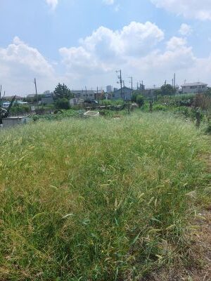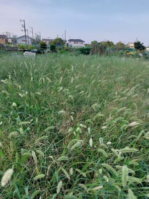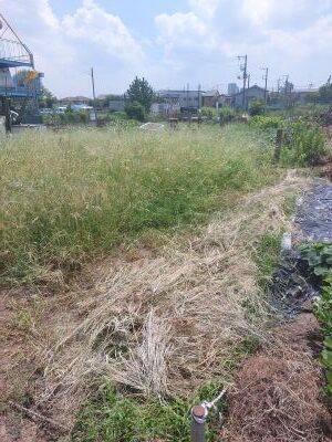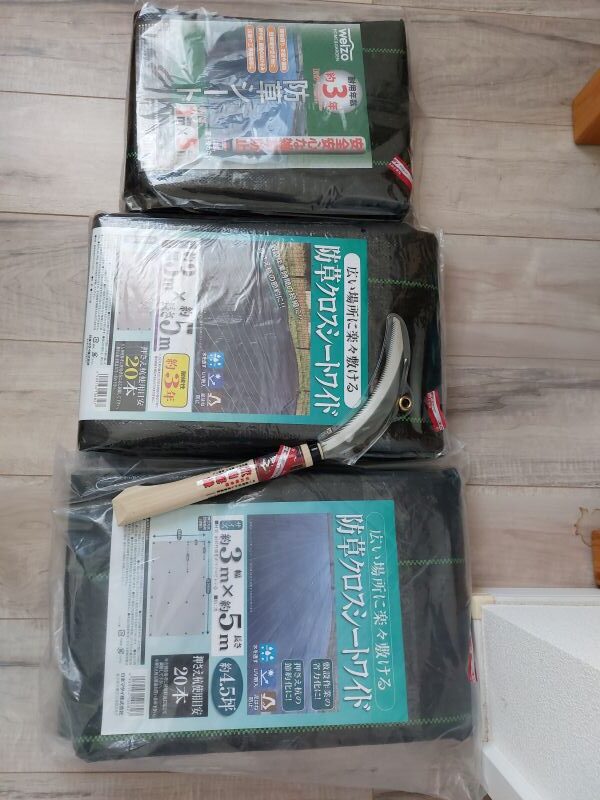 畑の雑草が大きくなって大変なことに!!防草シートと鎌を購入 朝6時に畑って2時間作業。暑くてふらふら、その上手にまめができて痛くてたまらないので退散。